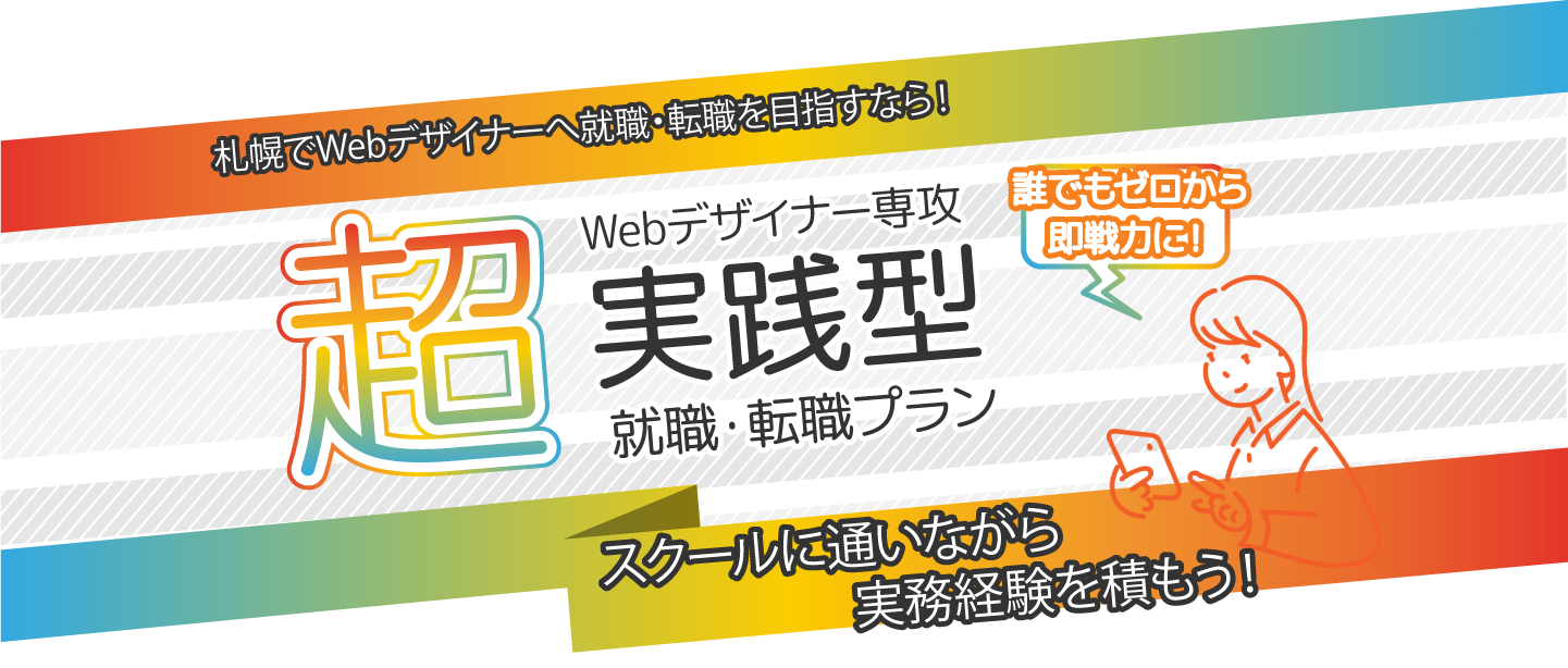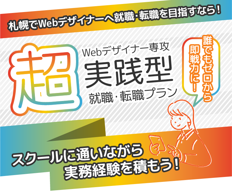 全国の仲間と学ぶ月2回の超実践専用クラスの授業とSTUDIO札幌の教室でのマンツーマントレーニングで、全国にも札幌にも一緒に学ぶ仲間ができる! 現役のグラフィックデザイナー、Webデザイナーによる指導をたくさん受けられるので、実践力が身に付きやすい!